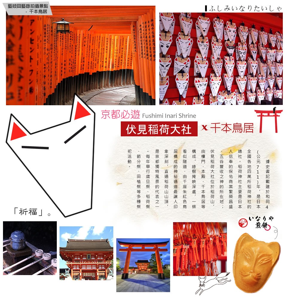 【伏見稻荷大社】是一座位於日本京都市伏見區內的神社,是遍及日本全國各地約三萬所的稻荷神社之總本社,也是近畿地方初詣參拜者最多的社寺(2010年日本國內第4位)。以境內所擁有的「千本鳥居」聞名。