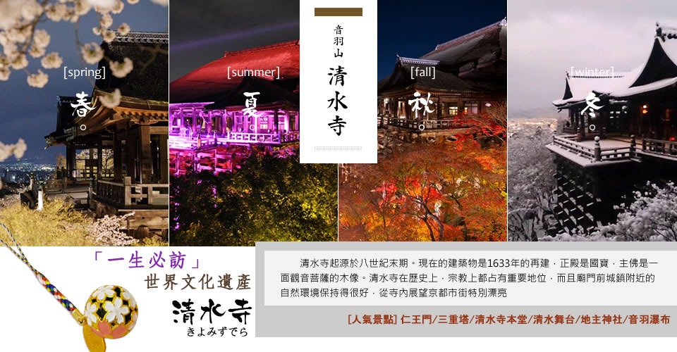 【音羽瀑布】清水寺正殿旁有一小山泉瀑布,數千年來順著音羽山湧出,流水清澈,終年不斷,稱為音羽瀑布。音羽瀑布或有金色水之稱,或有延命水之稱,被列為日本十大名水之首。