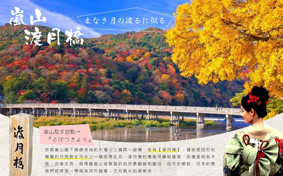 【嵐山竹林】位於嵐山北方,盤踞在優美的小倉山東麓,曾經是皇室的別墅所在地。竹林與小籬笆環繞的小徑十分典雅迷人,從野宮神社到化野念佛寺之間的漫步小徑上,有常寂光寺、落柿舍、大覺寺、二尊院等座落其間,氣氛寧靜幽雅。化野念佛寺有一萬尊以上作者不詳的石佛像,亦十分著名。